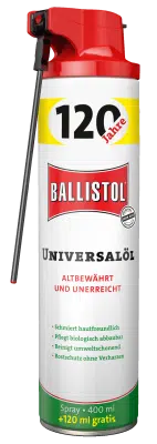 Ob für Handwerk, Haus oder Hobby, ob zum Pflegen, Schützen, Reinigen oder Schmieren, ob daheim, am Arbeitsplatz oder unterwegs – Ballistol Universalöl ist das richtige Öl für 1.000 Fälle und mehr. Es wird als Rostschutz, Schmieröl, Pflege- und Reinigungsmittel eingesetzt und glänzt dabei seit als 115 Jahren mit vielen hervorragenden Eigenschaften.