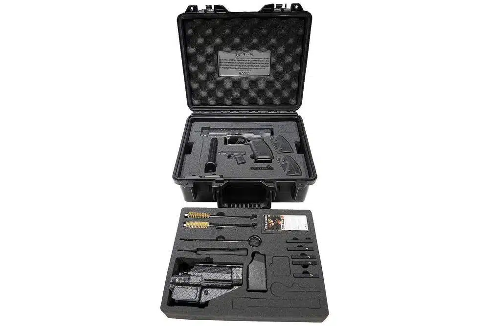 CANiK präsentiert mit der SFx RIVAL-S den nächsten Schritt in der Entwicklung hochwertiger Schusswaffen. Diese Pistole mit Stahlrahmen ist die Weiterentwicklung der mehrfach preisgekrönten SFx RIVAL. Die Ergonomie der Plattform ist unverändert, die Waffe ist nun jedoch komplett aus Metall gefertigt. Die 1185 g schwere SFx Rival-S ist 205,5 mm lang, hat eine Lauflänge von 127 mm, ist 36 mm breit und 145 mm hoch. Die SFx RIVAL-S hat ein 9 x 19 mm großes Patronenlager. Das zusätzliche Gewicht und der 90°-Knickabzug aus Aluminium reduzieren den Rückstoß und verbessern die Taktzeiten sowie die Präzision! Kurz gesagt: Die SFx RIVAL-S ist „Für höchste Ansprüche geschmiedet!“