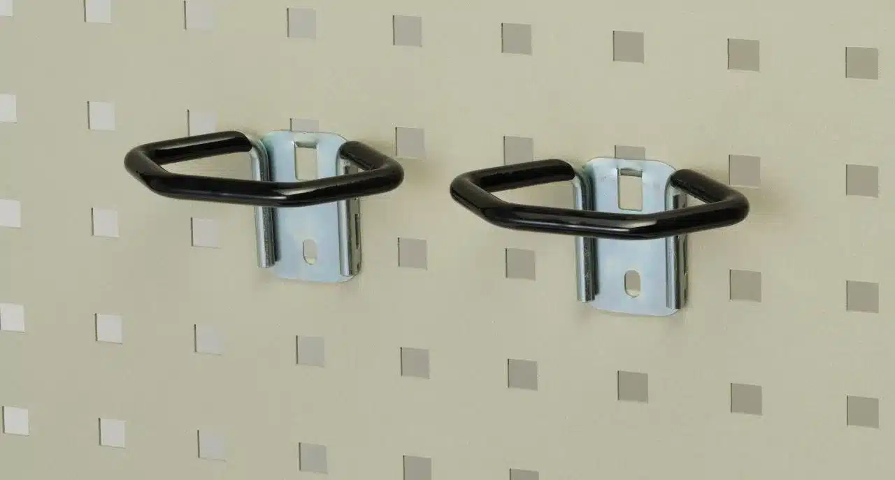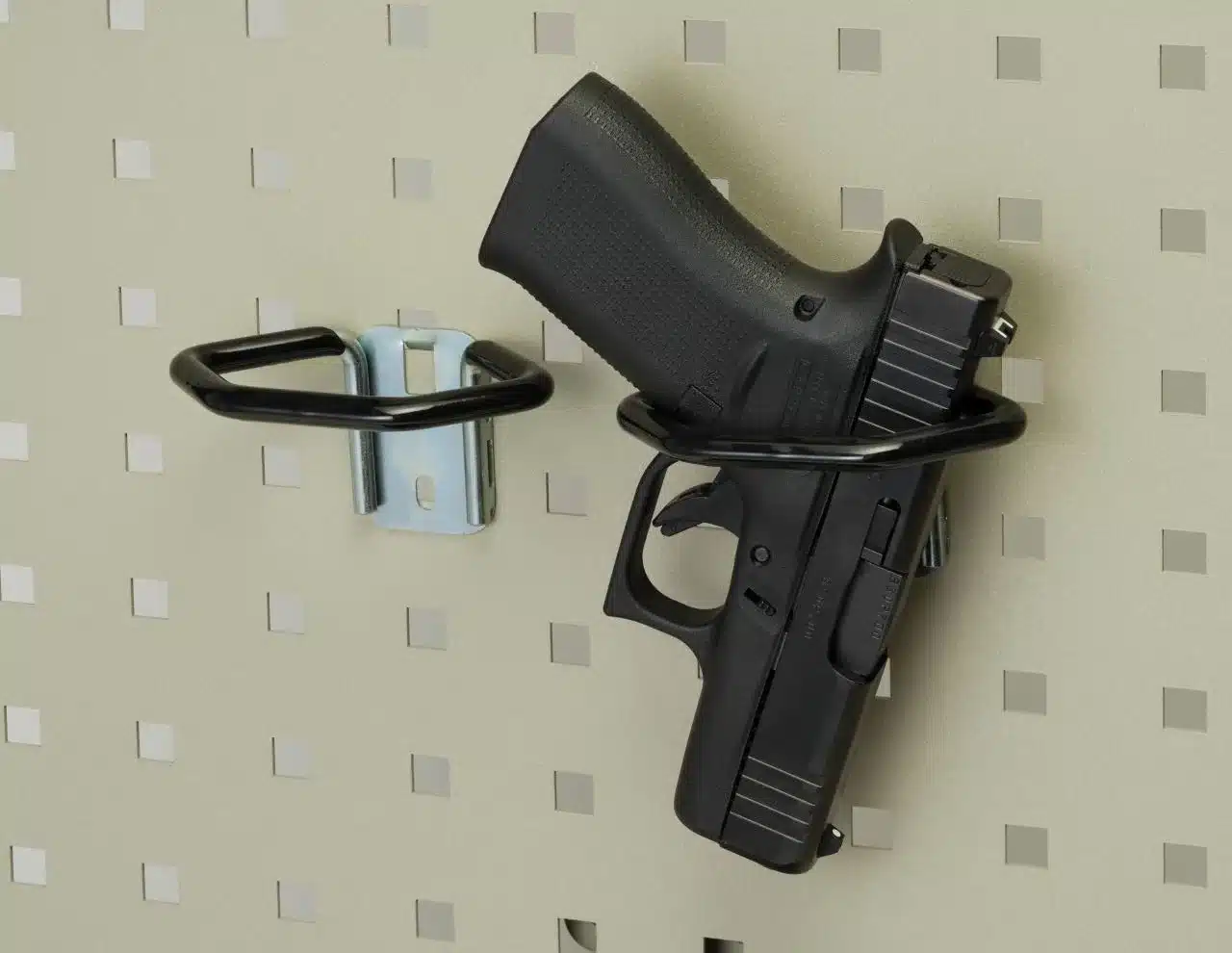 - Das Paket umfasst zwei Pistolenständer, die mit integrierten Haken und Spreizmutterösen in Square-Lok-Platten einrasten.