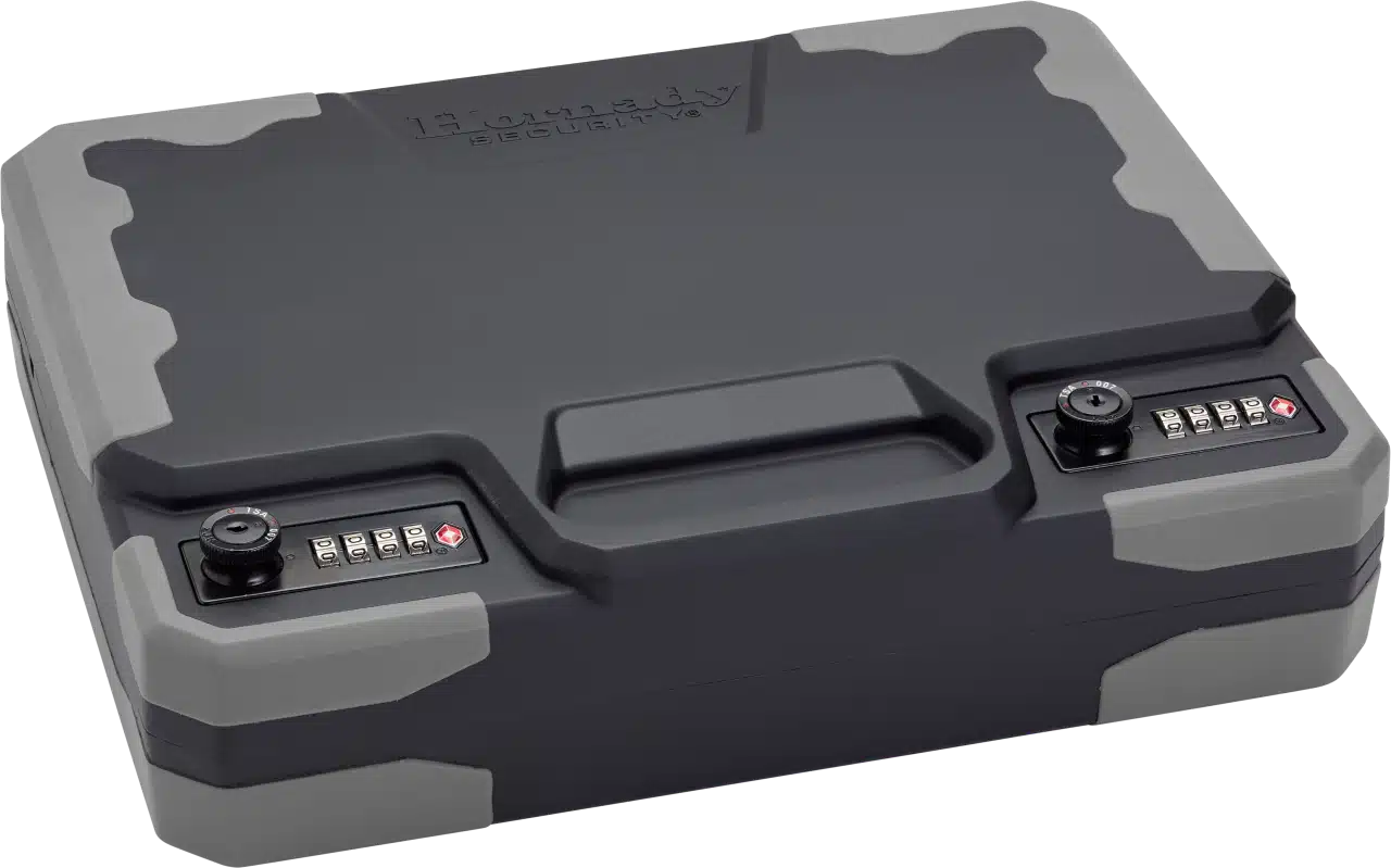 Hornady hat den perfekten Reisesafe entwickelt, die Treklite Lock Box mit doppeltem TSA-Kombinationsschloss XXL. Sie verfügt über zwei 4-stellige TSA-Schlösser, die erweiterte Sicherheit und bis zu 10.000 benutzerprogrammierbare Codes bieten. Sie können Schusswaffen, Munition und andere Wertgegenstände auf Reisen aufbewahren oder den Safe zu Hause oder in Ihrem Fahrzeug verwenden.